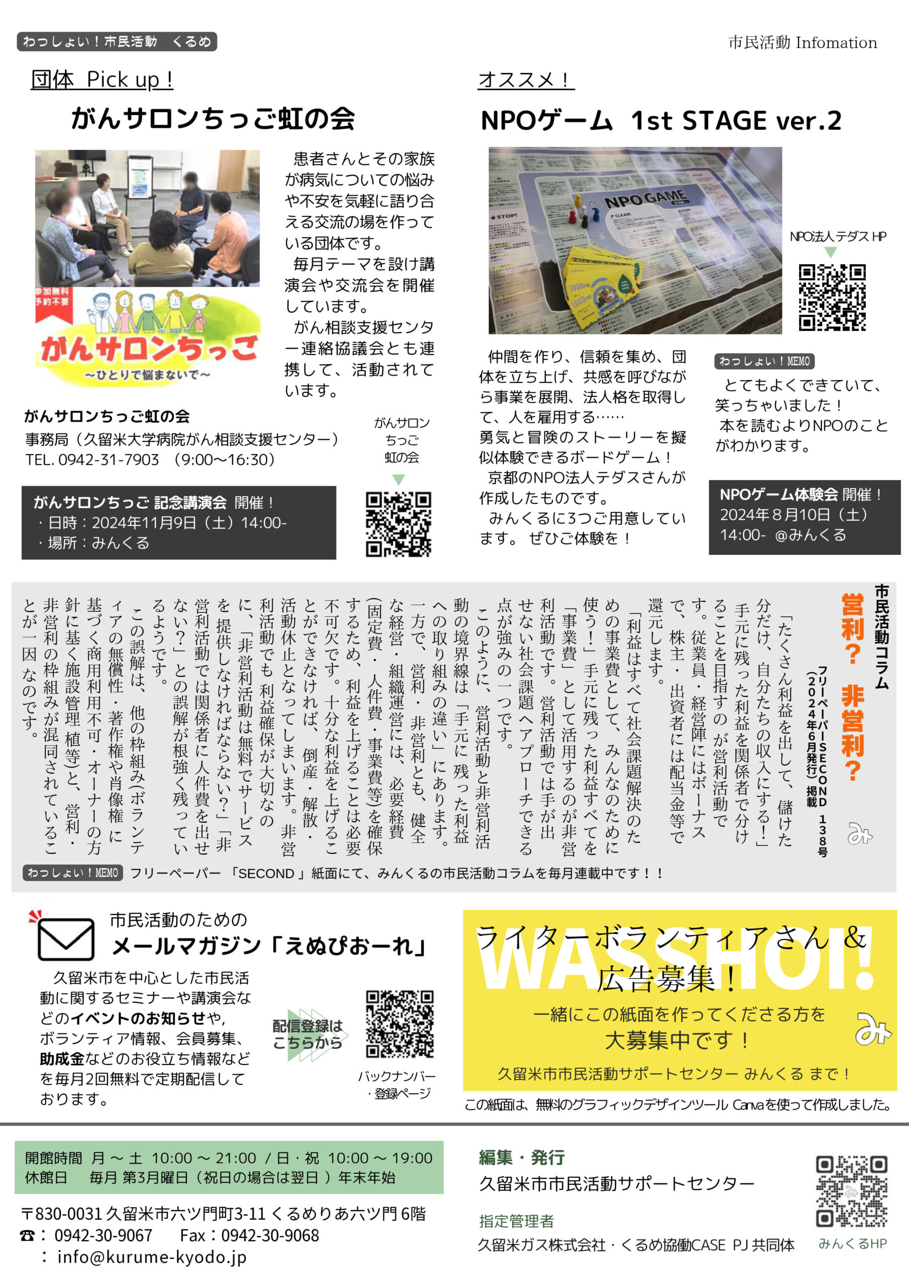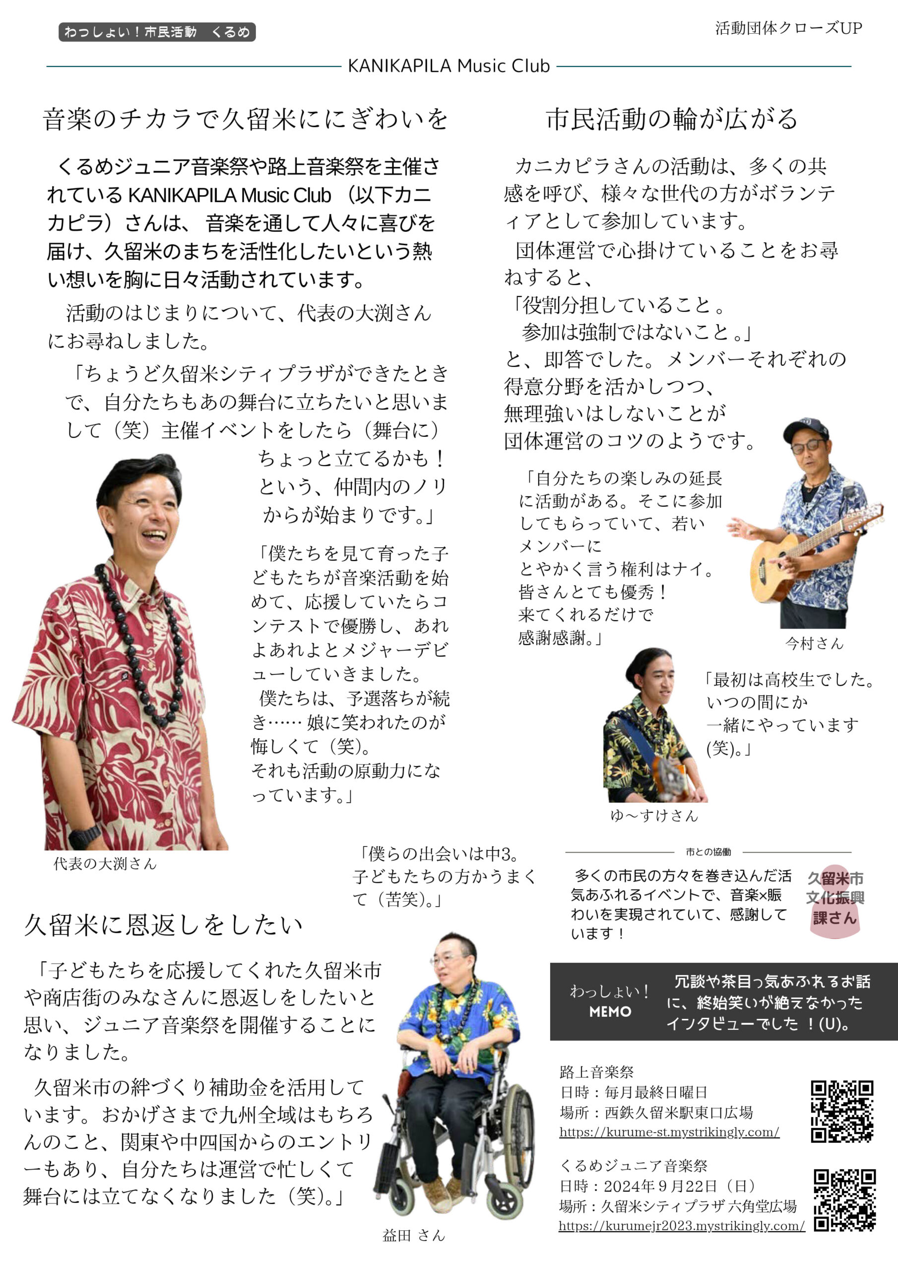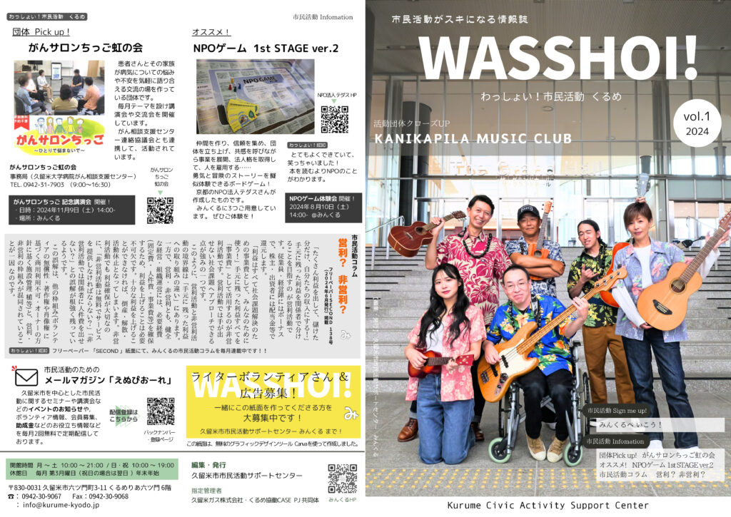 お知らせ2024年6月30日 WASSHOI ! 市民活動 くるめ Vol.1 ❤ 市民活動がスキになる情報誌 WASSHOI ! 市民活動 くるめ Vol.1( 2024年6月発行 ) 市民活動がスキになる情報誌 WASSHOI ! 市民活動 くるめ Vol.1[ PDFファイル : 3.5MB ]