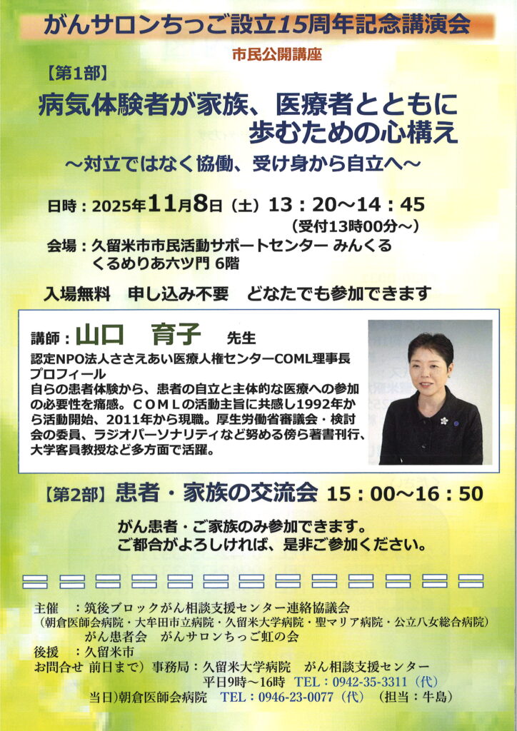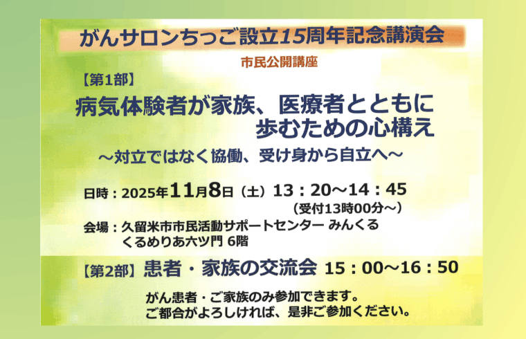がんサロンちっご設立15周年を記念して講演会が行われます。
