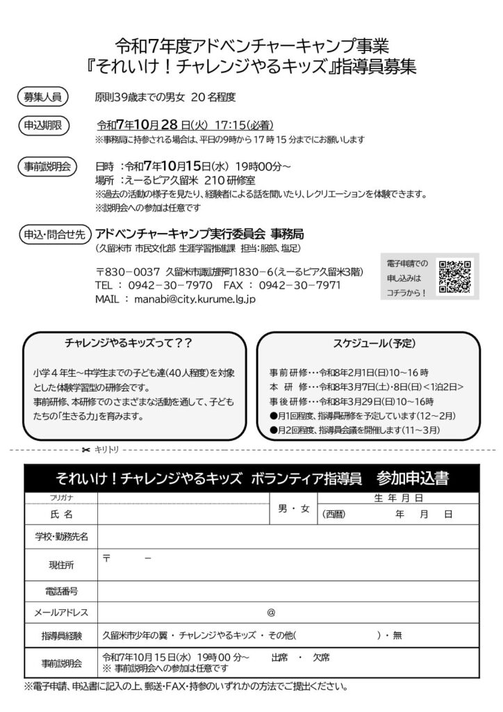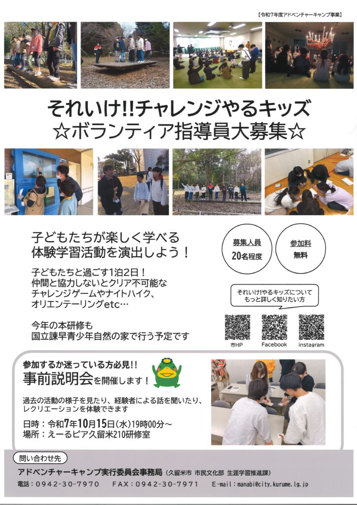 主催・問合せ:アドベンチャーキャンプ実行委員会 事務局(久留米市 市民文化部 生涯学習推進課)