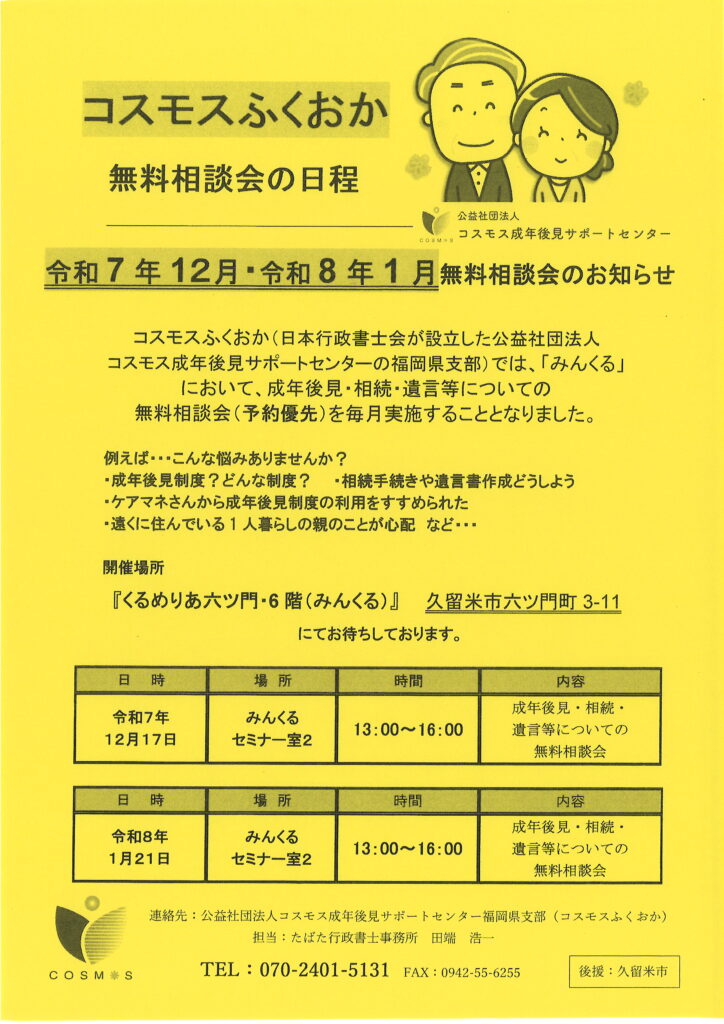 行政書士による成年後見や相続、遺言等に関する無料相談会(予約優先)です。