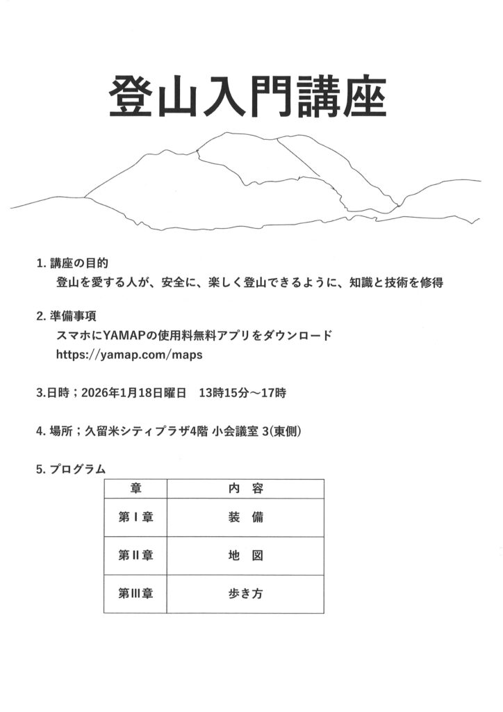 2026年1月 イベント・講座2025年12月13日 1/18 登山入門講座 山登りを楽しみましょう~里山から百名山まで~ 山登りを楽しむための、登山のイロハ(装備、地図、歩き方)を学びます。詳細はチラシ、または直接お問い合わせください。 ■ 日時:2026年1月18日(土)13:15~17:00 ■ 会場:久留米シティプラザ4階 小会議室3(東側) ■ 対象:成人、健康で高良山を歩ける方 ■ 参加費:500円(料金当日徴収) ■ 定員:20名 ■ 申し込み期限:開催日3日前まで ■ 主催:久留米所在の山の会「のぼろうかい」 ■ 申込み:rkac-nishidome@ymail.ne.jp