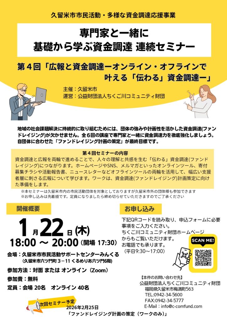 全6回の講座で、ファンドレイザー(非営利組織における資金調達の専門家)として活動する公益財団法人ちくご川コミュニティ財団が講師として、資金調達の力の徹底強化プログラムをご提供されます。