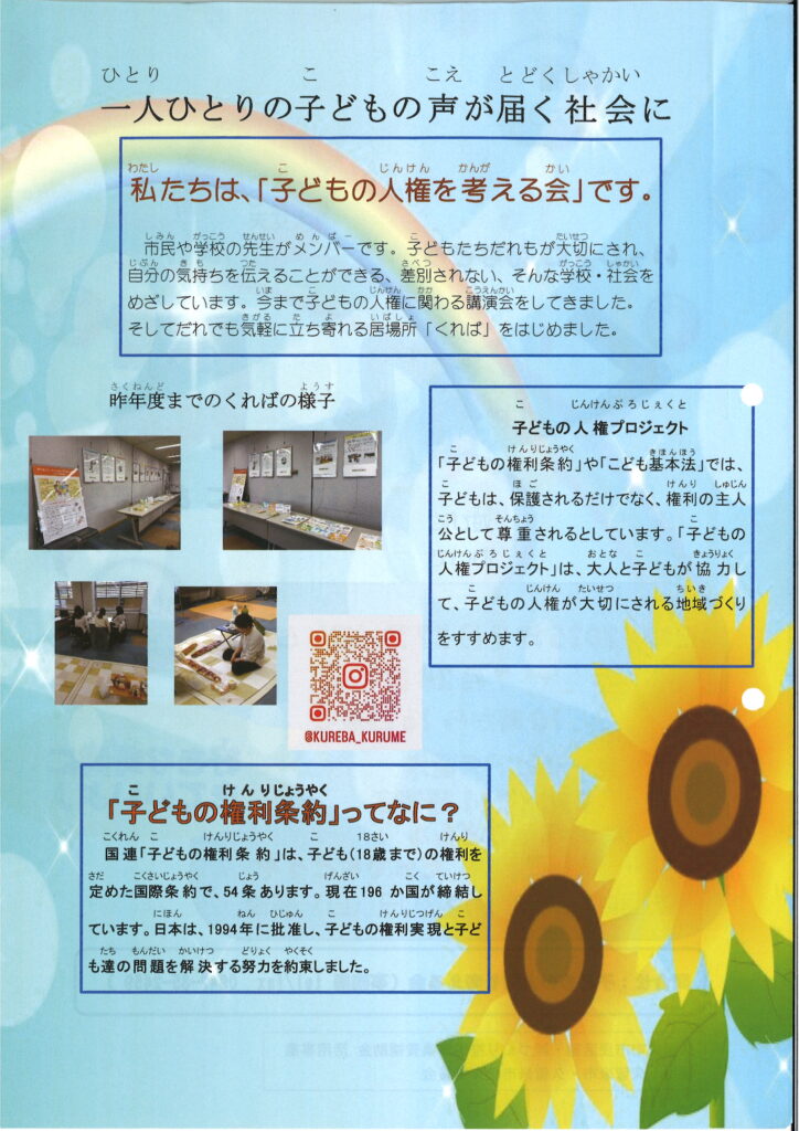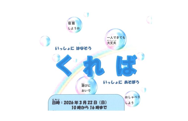 「子どもの人権を考える会」では3/22(日)にえーるピア久留米で開設する「こどもの居場所『くれば』」で一緒に活動する高校生・大学生ボランティアを募集しています。