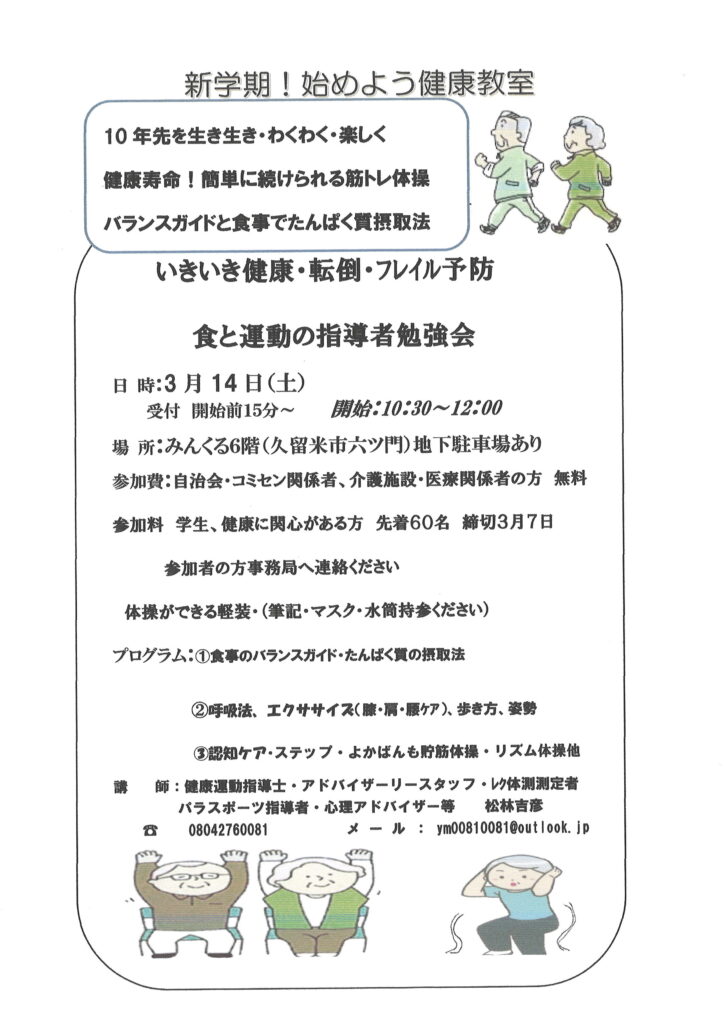 健康維持や、転倒・フレイル予防のための食と運動の指導者勉強会が開催されます。