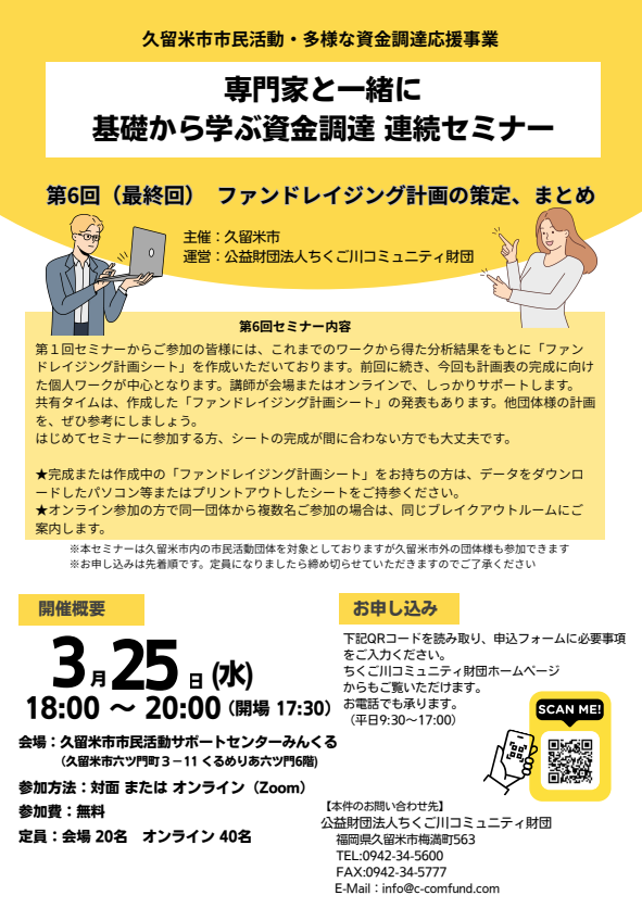 全6回の講座で、ファンドレイザー(非営利組織における資金調達の専門家)として活動する公益財団法人ちくご川コミュニティ財団が講師として、資金調達の力の徹底強化プログラムをご提供されます。