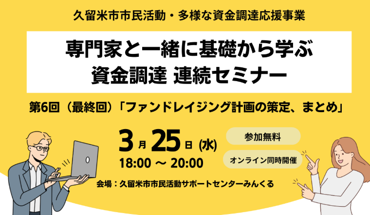 全6回の講座で、ファンドレイザー(非営利組織における資金調達の専門家)として活動する公益財団法人ちくご川コミュニティ財団が講師として、資金調達の力の徹底強化プログラムをご提供されます。