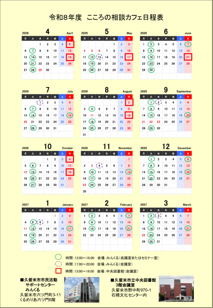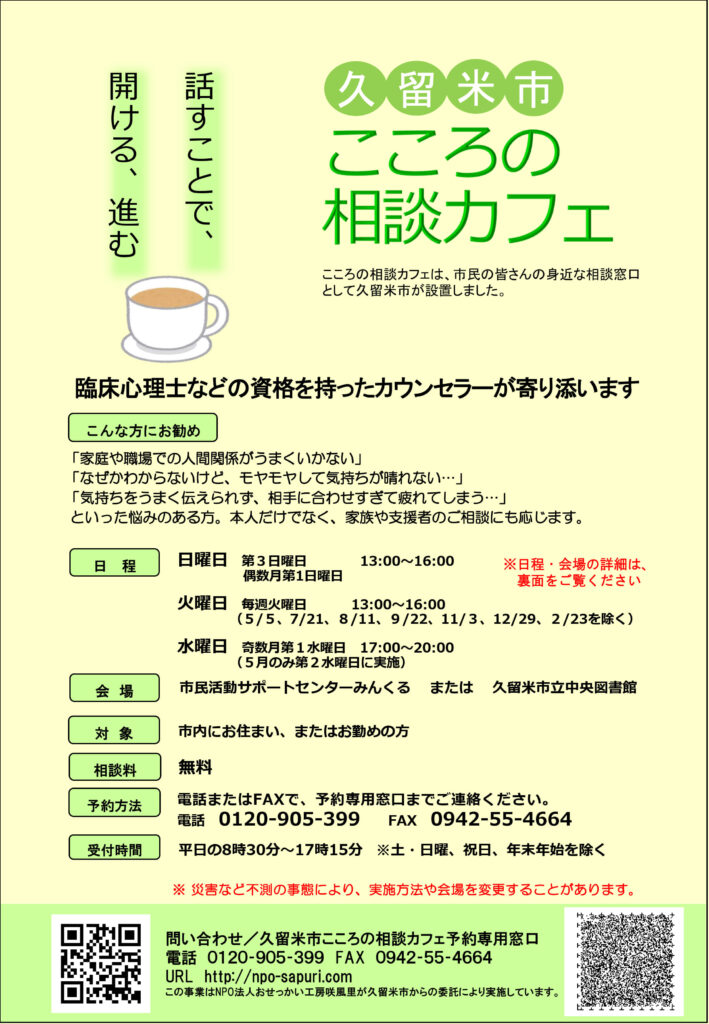 ■問合:久留米市こころの相談カフェ予約専用窓口
