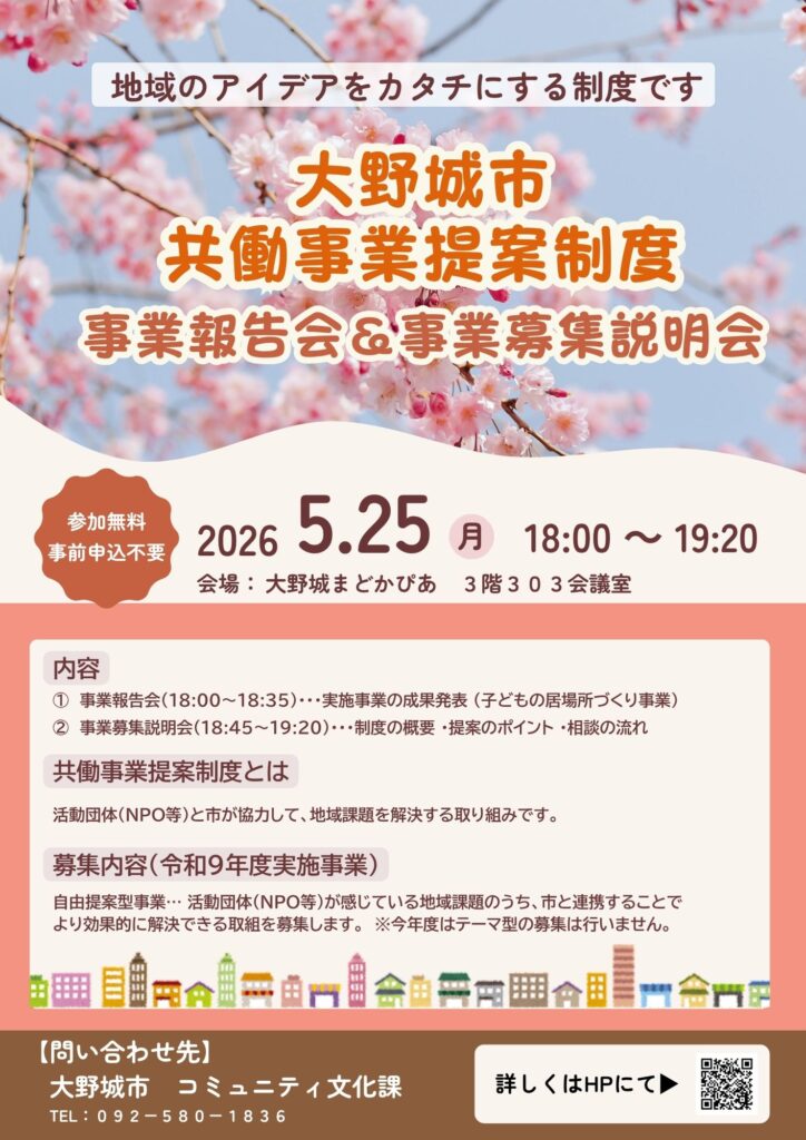 活動団体(NPO等)と大野城市が連携して地域課題を解決する「共働事業提案制度」。